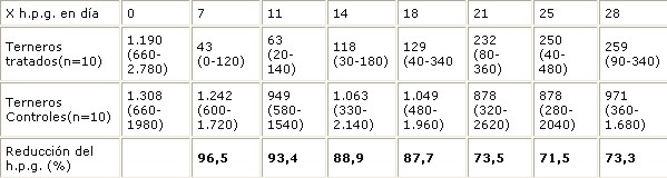 Tabla 1. Efecto de la administración de moxidectina (250 mcg / kg) en terneros sin acceso a pasturas e inoculados con una cepa de Cooperia pectinata * resistente a las avermectinas . Promedio y rango del número de huevos por gramo de heces (h.p.g.).