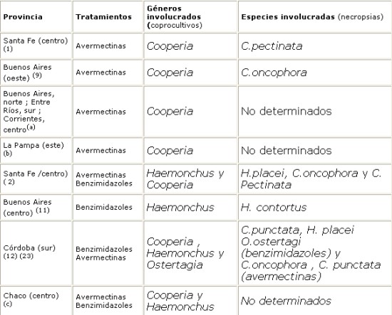 En la Tabla 2 se sintetiza la información de casos de resistencia de los nematodes bovinos a los benzimidazoles y lactonas macrocíclicas, que han sido publicados, son investigaciones aún en desarrollo o provienen de informantes calificados desde su aparición en el año 2000 hasta el presente en la Argentina.