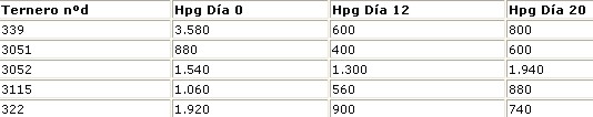 Tabla 3. Inoculación de terneros con una cepa de Cooperia pectinata resistente a las avermectinas (inóculos variables de 12.000 a 20.000 larvas). Promedio del hpg a los días 12 y 20 post tratamiento con ivermectina 1 % (200 mcg/kg).