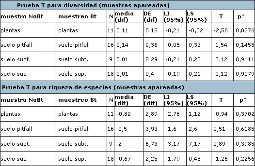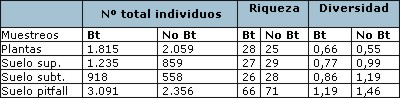 No hubo diferencias estadísticamente significativas en la riqueza de especies en los maíces Bt y no Bt, ni tampoco en diversidad para cada tipo de muestreo excepto en el caso de los artrópodos observados en plantas, que se presentaron con mayor diversidad en el maíz Bt (Cuadro 1 y 2).