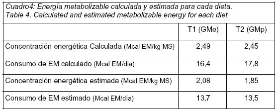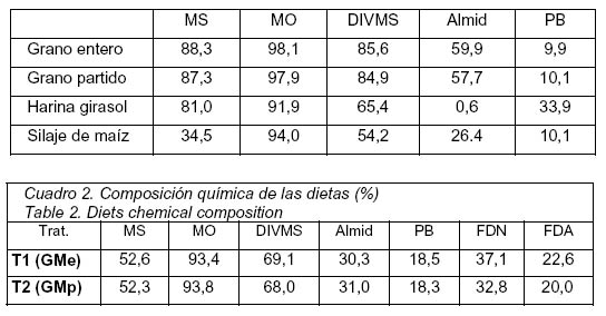 Efecto sobre la ganancia de peso y tasa de engrasamiento. En Cuadro 3 se muestran los resultados de los parámetros productivos obtenidos. No se observaron diferencias significativas (P>0.05) con respecto al peso inicial y final en los animales que conformaban los dos tratamientos. Las ganancias diarias de peso fueron de 1.01 ± 0.38 y 0.99 ± 0.13 kg para GMe y GMp respectivamente, no encontrando diferencias estadísticamente significativas (P>0.05). Estos resultados coinciden con los hallados por Robert, Preston, Klosterman y Cahill (1972) y Owens, Secrist, Hill y Gill (1997), trabajando con similares niveles de silo de maíz y grano. Si bien las ganancias de peso fueron bajas, para dietas con un alto nivel de concentrados, los valores son similares a los encontrados por Santini, Pavan, García y Castaño (1997), en similares condiciones y con el mismo tipo de animal. Con respecto a los milímetros de grasa dorsal inicial y final, no se encontraron diferencias (P>0.05) entre los dos tratamientos. Para el tratamiento con grano entero la tasa de engrasamiento fue un 29% mayor que para GMp, pero la diferencia no fue significativa (P>0.05). Esta tendencia podría deberse a una mayor eficiencia de utilización de la glucosa, ya que en dietas donde el grano se encuentra entero o poco procesado, una mayor proporción de almidón escapa a la degradación bacteriana ruminal alcanzando el intestino delgado, donde el almidón digerido provee un 42 % más de energía que si se digiere en el rumen (Owens, Zinn y Kim, 1986).