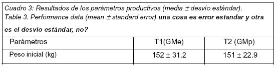Cuadro 3: Resultados de los parámetros productivos (media ± desvío estándar). Una cosa es error estandar y otra es el desvio estándar, no?