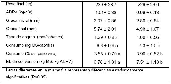 Sobre los animales se realizaron las siguientes mediciones: a) Ganancia diaria de peso vivo (GDPV): se calculó individualmente por diferencia entre el peso final y el inicial sobre el total de días de ensayo. b) Tasa de engrasamiento: por medio de determinaciones ultrasonográficas, cada 28 días, del espesor de grasa dorsal entre la 12° y 13° costilla (Ecógrafo Aloka 210 con traductor lineal de 3,3 Mhz.); por regresión lineal se obtuvo la tasa mensual de engrasamiento c) Consumo diario: se determinó por diferencia entre el suministro y rechazo de MS. Las mediciones se realizaron en forma grupal (por corral) cuatro veces por semana. d) Consumo de energía metabolizable (EM): se estimó a partir del consumo de MS y de la concentración de EM de cada una de las dietas, calculada en base a su DIVMS (EM calculada, AFRC, 1993). Adicionalmente, se estimó cual debió ser el consumo de EM para lograr las ganancias de peso vivo observadas en base al sistema NRC (1976), (EM estimada). Para ello se asumió que la composición de la ganancia de peso de los dos tratamientos fue igual. e) Eficiencia de conversión (kg MS: kg GDPV): se calculó en base al consumo de MS y la tasa de aumento de peso vivo. Los datos se analizaron por ANOVA según un diseño completamente aleatorizado (DCA), con dos tratamientos (grano de maíz entero y partido) y tres repeticiones (corrales) por tratamiento, empleando el paquete estadístico SAS (1990).