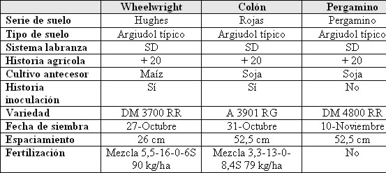 Se realizaron tres experimentos en los que se compararon dos tratamientos, T0: sin y T1: con inoculación con bacterias del género Bradyrhizobium japonicum a dosis de marbete. En las tres localidades se utilizó un diseño en bloques completos aleatorizados con cuatro repeticiones. Datos de suelo y manejo de los mismos se presentan en la Tabla 1: