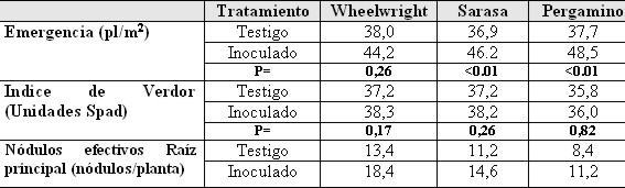 Los tratamientos que recibieron inoculación sobre la semilla alcanzaron un mayor número de plantas emergidas y una tendencia a formar mayor número de nódulos efectivos sobre la raíz principal. En cambio, no se determinaron diferencias significativas en el índice de verdor ni en los rendimientos, a pesar de observarse en dos ensayos una tendencia favorable a los tratamientos inoculados. Los resultados obtenidos alientan a estudiar con mayor profundidad los efectos de nuevos inoculantes con efecto promotor sobre el crecimiento vegetal.