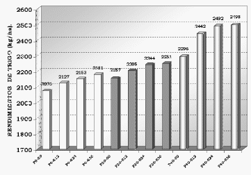 Gráfico 1. Producción de trigo en función de los niveles de P y de S luego de una fertilización básica con nitrógeno. Bernardo de Irigoyen. Santa Fe.