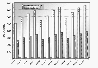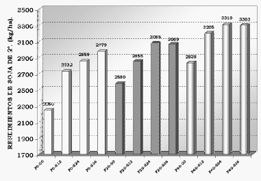 En la Soja de 2º (Vivas et al, 2001ª) la fertilización inicial en trigo tuvo un efecto residual significativo en el P (Pr>F=0,0001) y el S (Pr>F=0,0001) pero sin registrar una interacción significativa de PxS (Pr>F=0,4207). Los resultados pueden verse en el Gráfico 2.