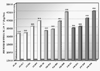 Los aumentos promedio por sobre el testigo P0 fueron de 192 kg/ha y 459 kg/ha para los tratamientos P20 y P40, respectivamente. La respuesta al S fue más notable que la del P, con incrementos sobre el testigo S0 de 375, 525 y 561kg/ha, para los niveles S12, S24 y S36, respectivamente (LSD). La Soja de primera luego del doble cultivo se puede ver en el Gráfico 3.