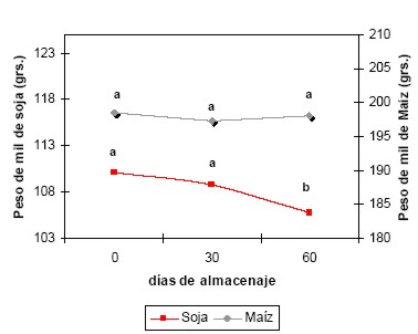 Este parámetro presenta tendencias disímiles en ambos ensayos (Gráfico 10). En la bolsa plástica que contiene soja presenta una disminución significativa del peso de mil granos entre los 30 y 60 días de almacenado y para maíz no existen diferencias en la materia seca en distintos períodos de tiempo. Dicha disminución del peso de mil no coincide con la bibliografía (Casini y otros, 2005), que presenta a humedad por debajo de 14 % como de bajo riesgo de deterioro. Los motivos que causaron estas diferencias no pueden ser explicadas en el presente trabajo, requiriéndose nuevas experiencias para estudiar el fenómeno con más precisión. Los resultados de maíz coinciden con la información presentada por el PRECOP (Casini y otros, 2005), en el cual a humedades de 15-16 % el grano presenta un riesgo bajo de deterioro durante un período de dos meses.