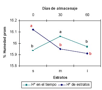 • Con el tiempo de almacenamiento se observó una estratificación de la humedad