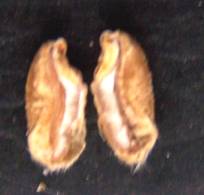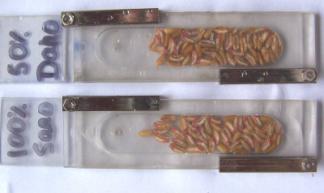 1- Se cortan 50 granos de trigo por la mitad, una de las mitades se coloca en una cubeta y la otra se desecha. En la foto se puede observar como debe quedar el corte (Izquierda) y dos cubetas llenas con medios granos (Derecha).