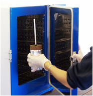 2- Se colocan las cubetas en la solución de tetrazolio al 0,5 % P/V que es mantenida durante diez minutos a una temperatura constante en el rango de 43 a 45 ºC (Izq.).