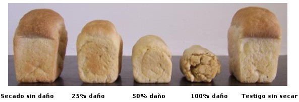 La siguiente fotografía de los panes obtenidos ilustra las diferencias en calidad panadera generadas con las distintas proporciones de grano dañado.