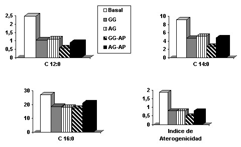 El consumo de AG saturados presentes en la leche de 4 a 10 átomos de carbono (C4:0 a C10:0 ,7 a 10% del total de AG) no conduce a elevaciones en el colesterol circulante ni estaría asociado a riesgos de muerte por afecciones coronarias. Los AG contraindicados son los ácidos láurico (C12:0), mirístico (C14:0) y palmítico (C14:0) ya que elevan el colesterol plasmático total y el colesterol malo (LDL) cuando son consumidos en exceso. La suplementación de la vaca (con grano de girasol (2kg), aceite de girasol (0,8 kg) solos o combinados con aceite de pescado (0,24 kg)) nos permitió reducir la concentración grasa total de la leche y la fracción hipercolesterolémica de la misma: 63% para C12:0, 51% para C14:0 y 29% para C16:0. (Figura 1).