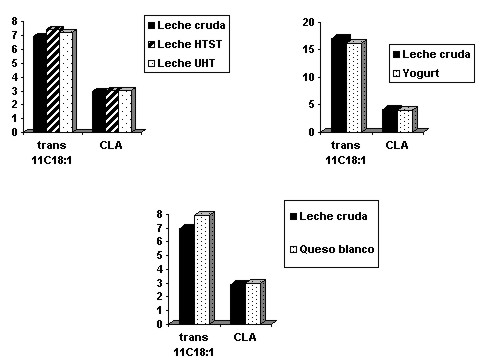 La concentración del trans11-C18:1 resultó ligeramente incrementada (+7%) por el proceso HTST de pasteurización. La concentración del CLA no varió. La calidad funcional de la leche pasteurizada permaneció intacta reflejando la composición en AG de la leche cruda. La elaboración de yogurt no modificó las concentraciones de CLA o de su precursor en el producto. La calidad nutricional del yogurt resultó fuertemente condicionada por la composición en AG de la leche de origen. Para el queso blanco untable la recuperación de los diferentes AG fue alta y la del CLA en particular alcanzó un promedio de 101% reflejando la concentración de la leche de origen. Resulta necesario expandir esta información hacia otras técnicas de elaboración integrando eventuales efectos de diversos procesos y bacterias iniciadoras involucradas en cada variedad de queso.