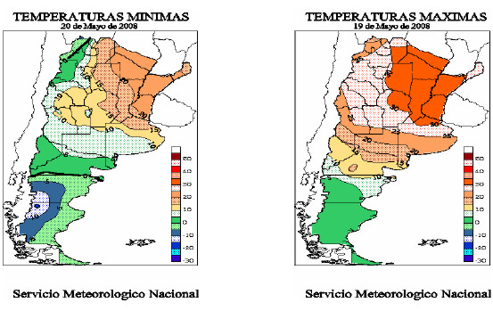ESTE DE SALTA, ESTE DE JUJUY Y TUCUMAN CIELO ALGO O PARCIALMENTE NUBLADO. VIENTOS LEVES DEL NORESTE. TEMPERATURA MÍNIMA ENTRE 15°C Y 18ºC. TEMPERATURA MÁXIMA ENTRE 28ºC Y 30ºC. MISIONES, NORTE DE CORRIENTES, CHACO Y FORMOSA CIELO PARCIALMENTE NUBLADO, LUEGO NUBOSIDAD VARIABLE. VIENTOS LEVES A MODERADOS DEL NORESTE, ROTANDO AL NORTE. TEMPERATURA MÍNIMA ENTRE 19°C Y 22ºC. TEMPERATURA MÁXIMA ENTRE 29ºC Y 31ºC. SANTIAGO DEL ESTERO Y CORDOBA NUBOSIDAD VARIABLE. TIEMPO INSTABLE DURANTE LA MAÑANA. VIENTOS LEVES DEL SECTOR NORTE, ROTANDO AL NORESTE. TEMPERATURA MÍNIMA ENTRE 18°C Y 20ºC. TEMPERATURA MÁXIMA ENTRE 27ºC Y 31ºC. SAN LUIS NUBOSIDAD VARIABLE. TIEMPO INSTABLE A PARTIR DE LA TARDE. VIENTOS LEVES DEL NOROESTE, ROTANDO AL SECTOR NORTE. TEMPERATURA MÍNIMA ENTRE 14°C Y 16ºC. TEMPERATURA MÁXIMA ENTRE 24ºC Y 26ºC. SUR DE CORRIENTES, SANTA FE Y ENTRE RIOS NUBOSIDAD VARIABLE. TIEMPO INESTABLE. VIENTOS LEVES DEL SECTOR NORTE. TEMPERATURA MÍNIMA ENTRE 18°C Y 20ºC. TEMPERATURA MÁXIMA ENTRE 30ºC Y 32ºC. NOROESTE DE BUENOS AIRES NUBOSIDAD VARIABLE. TIEMPO INESTABLE. VIENTOS LEVES DEL SECTOR NORTE. TEMPERATURA MÍNIMA ENTRE 13°C Y 15ºC. TEMPERATURA MÁXIMA ENTRE 23ºC Y 26ºC. NORESTE DE BUENOS AIRES NUBOSIDAD VARIABLE. VIENTOS LEVES DEL NORESTE, ROTANDO AL SECTOR ESTE. TEMPERATURA MÍNIMA ENTRE 13°C Y 16ºC. TEMPERATURA MÁXIMA ENTRE 24ºC Y 26ºC. NORTE Y OESTE DE LA PAMPA CIELO PARCIALMENTE NUBLADO O NUBLADO. TIEMPO INESTABLE. VIENTOS LEVES A MODERADOS DEL SECTOR NORTE, CAMBIANDO AL SECTOR SUR. TEMPERATURA MÍNIMA ENTRE 12°C Y 14ºC. TEMPERATURA MÁXIMA ENTRE 23ºC Y 25ºC. CENTRO Y SUDESTE DE BUENOS AIRES CIELO PARCIALMENTE NUBLADO O NUBLADO. TIEMPO INESTABLE CON PROBABILIDAD DE PRECIPITACIONES. MEJORANDO. VIENTOS LEVES A MODERADOS DEL SECTOR NORTE. TEMPERATURA MÍNIMA ENTRE 10°C Y 14ºC. TEMPERATURA MÁXIMA ENTRE 18ºC Y 22ºC. SUDOESTE DE BUENOS AIRES Y SUR DE LA PAMPA CIELO NUBLADO. PROBABILIDAD DE LLUVIAS. VIENTOS LEVES A MODERADOS DEL NOROESTE, CAMBIANDO AL SECTOR SUR. TEMPERATURA MÍNIMA ENTRE 8°C Y 11ºC. TEMPERATURA MÁXIMA ENTRE 19ºC Y 22ºC.