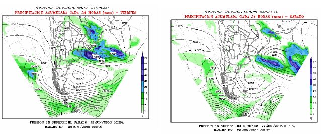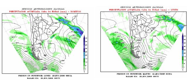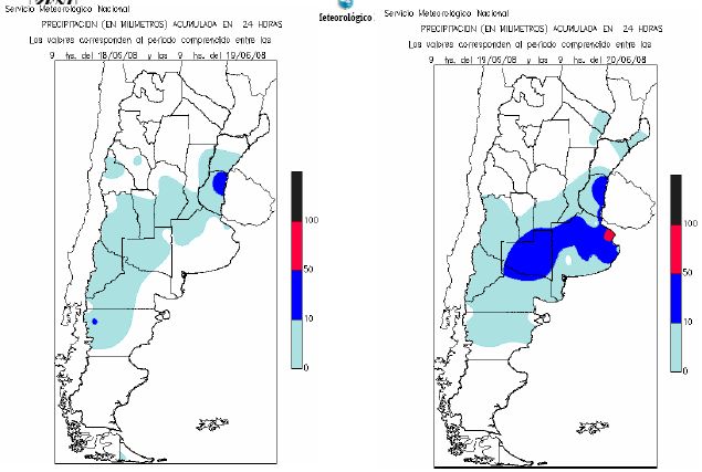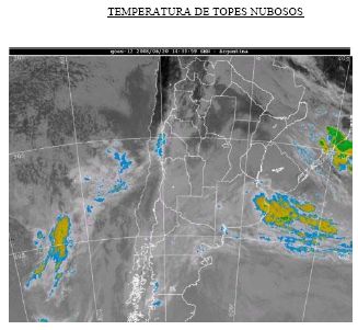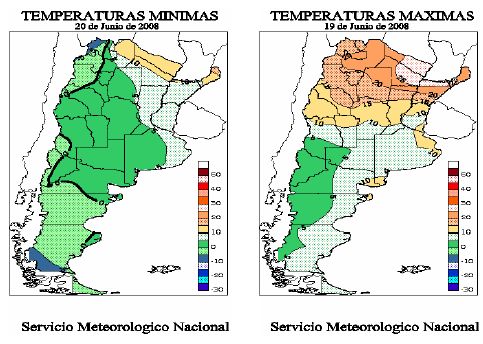 ESTE DE JUJUY, ESTE DE SALTA Y TUCUMÁN CIELO NUBLADO. PROBABILIDAD DE LLUVIAS Y LLOVIZNAS. VIENTOS LEVES DEL SECTOR SUR. TEMPERATURA MÍNIMA ENTRE 5°C Y 8ºC. TEMPERATURA MÁXIMA ENTRE 10ºC Y 12ºC. OESTE DE FORMOSA Y CHACO CIELO NUBLADO A PARCIALMENTE NUBLADO. PROBABILIDAD DE LLUVIAS Y LLOVIZNAS DURANTE LA MAÑANA, LUEGO TIERMPO INESTABLE. VIENTOS LEVES DEL SECTOR SUR. TEMPERATURA MÍNIMA ENTRE 8°C Y 11ºC. TEMPERATURA MÁXIMA ENTRE 12ºC Y 15ºC. MISIONES, NORTE DE CORRIENTES, ESTE DE CHACO Y ESTE DE FORMOSA CIELO NUBLADO. PROBABILIDAD DE LLUVIAS Y TORMENTAS, LUEGO LLUVIAS Y LLOVIZNAS. VIENTOS LEVES DEL SECTOR SUR. TEMPERATURA MÍNIMA ENTRE 10°C Y 13ºC. TEMPERATURA MÁXIMA ENTRE 15ºC Y 19ºC. SANTIAGO DEL ESTERO Y NORTE DE SANTA FE CIELO NUBLADO. VIENTOS LEVES DEL SECTOR SUR. TEMPERATURA MÍNIMA ENTRE 6°C Y 8ºC. TEMPERATURA MÁXIMA ENTRE 12ºC Y 14ºC. SUR DE CORRIENTES, CENTRO Y SUR DE DE SANTA FE Y ENTRE RIOS PROBABILIDAD DE HELADAS AISLADAS. NUBOSIDAD VARIABLE. TIEMPO INESTABLE DURANTE LA MAÑANA. VIENTOS LEVES DEL SECTOR SUR. TEMPERATURA MÍNIMA ENTRE 2°C Y 6ºC. TEMPERATURA MÁXIMA ENTRE 12ºC Y 14ºC. NORESTE DE BUENOS AIRES MEJORANDO, CON NUBOSIDAD VARIABLE. VIENTOS LEVES DEL SECTOR SUR, ROTANDO AL SECTOR OESTE. TEMPERATURA MÍNIMA ENTRE 4°C Y 7ºC. TEMPERATURA MÁXIMA ENTRE 12ºC Y 14ºC. SUDESTE DE BUENOS AIRES CIELO NUBLADO. PROBABILIDAD DE LLUVIAS Y LLOVIZNAS. VIENTOS MODERADOS DEL SUDESTE. TEMPERATURA MÍNIMA ENTRE 7°C Y 11ºC. TEMPERATURA MÁXIMA ENTRE 11ºC Y 14ºC. CORDOBA Y SAN LUIS PROBABILIDAD DE HELADAS AISLADAS. NUBOSIDAD VARIABLE, LUEGO CIELO NUBLADO. VIENTOS LEVES DEL SECTOR SUR, LUEGO DE DIRECCIONES VARIABLES. TEMPERATURA MÍNIMA ENTRE 4°C Y 5ºC. TEMPERATURA MÁXIMA ENTRE 9ºC Y 11ºC. LA PAMPA Y OESTE DE BUENOS AIRES PROBABILIDAD DE HELADAS. NUBOSIDAD VARIABLE, LUEGO CIELO NUBLADO. VIENTOS LEVES DEL SUDOESTE, LUEGO DE DIRECCIONES VARIABLES, PREVALECIENTES DEL OESTE. TEMPERATURA MÍNIMA ENTRE 2°C Y 5ºC. TEMPERATURA MÁXIMA ENTRE 8ºC Y 11ºC.