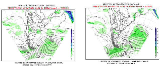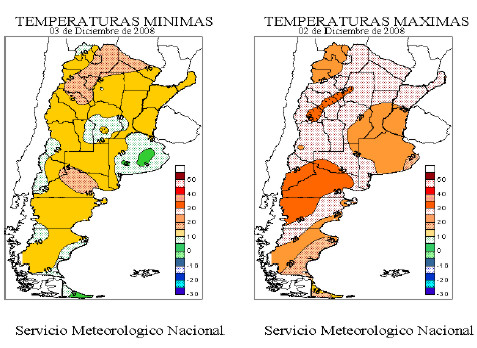 ESTE DE JUJUY, ESTE DE SALTA Y TUCUMAN NUBOSIDAD VARIABLE. PROBABILIDAD DE DE LLUVIAS AISLADAS. VIENTOS LEVES DEL SECTOR NORTE. TEMPERATURA MÍNIMA ENTRE 15°C Y 18ºC. TEMPERATURA MÁXIMA ENTRE 29ºC Y 33ºC. OESTE DE SANTIAGO DEL ESTERO Y NOROESTE DE CORDOBA NUBOSIDAD VARIABLE DURANTE LA MAÑANA, LUEGO CIELO PARCIALMENTE NUBLADO. VIENTOS LEVES DEL SECTOR NORTE. TEMPERATURA MÍNIMA ENTRE 16°C Y 19ºC. TEMPERATURA MÁXIMA ENTRE 31ºC Y 34ºC. CHACO, FORMOSA, NORTE DE CORRIENTES, MISIONES, NORTE DE SANTA FE, NORTE DE ENTRE RIOS Y NORESTE DE CORDOBA NUBOSIDAD VARIABLE DURANTE LA MAÑANA, LUEGO CIELO ALGO NUBLADO. VIENTOS LEVES DEL SECTOR NORTE. TEMPERATURA MÍNIMA ENTRE 11°C Y 15ºC. TEMPERATURA MÁXIMA ENTRE 29ºC Y 32ºC. NORESTE DE SANTIAGO DEL ESTERO, CHACO, FORMOSA, NORTE DE CORRIENTES Y MISIONES CIELO ALGO O PARCIALMENTE NUBLADO. VIENTOS LEVES DEL SECTOR NORTE. TEMPERATURA MÍNIMA ENTRE 14°C Y 17ºC. TEMPERATURA MÁXIMA ENTRE 30ºC Y 34ºC. SUDESTE DE SANTIAGO DEL ESTERO, NORESTE DE CORDOBA, NORTE DE SANTA FE, SUR DE CORRIENTES Y NORTE DE ENTRE RIOS NUBOSIDAD VARIABLE. PROBABILIDAD DE PRECIPITACIONES DURANTE LA MAÑANA, LUEGO MEJORANDO.VIENTOS LEVES DEL SECTOR NORTE. TEMPERATURA MÍNIMA ENTRE 14°C Y 17ºC. TEMPERATURA MÁXIMA ENTRE 32ºC Y 35ºC. NORTE DE SAN LUIS, SUR DE CORDOBA Y NORESTE DE LA PAMPA CIELO PARCIALMENTE NUBLADO A NUBLADO. PROBABILIDAD DE PRECIPITACIONES DURANTE LA MAÑANA, LUEGO MEJORANDO CON CIELO ALGO NUBLADO. VIENTOS LEVES DE DIRECCIONES VARIABLES, LUEGO DEL SECTOR NORTE. TEMPERATURA MÍNIMA ENTRE 16°C Y 19ºC. TEMPERATURA MÁXIMA ENTRE 32ºC Y 35ºC. SUR DE SANTA FE, SUR DE ENTRE RIOS Y NORTE Y CENTRO DE BUENOS AIRES NUBOSIDAD EN DISMINUCION. VIENTOS LEVES DEL SECTOR NORTE, CAMBIANDO AL SECTOR ESTE. TEMPERATURA MÍNIMA ENTRE 12°C Y 16ºC. TEMPERATURA MÁXIMA ENTRE 30ºC Y 34ºC. CENTRO Y SUR DE LA PAMPA Y SUDOESTE DE BUENOS AIRES CIELO PARCIALMENTE NUBLADO A NUBLADO. PROBABILIDAD DE PRECIPITACIONES DURANTE LA MAÑANA, LUEGO MEJORANDO CON NUBOSIDAD VARIABLE. VIENTOS CAMBIANDO A LEVES DEL SECTOR NORTE. TEMPERATURA MÍNIMA ENTRE 9°C Y 13ºC. TEMPERATURA MÁXIMA ENTRE 29ºC Y 32ºC. SUDESTE DE BUENOS AIRES CIELO ALGO NUBLADO. VIENTOS CAMBIANDO A LEVES DEL SECTOR NORTE. TEMPERATURA MÍNIMA ENTRE 11°C Y 14ºC. TEMPERATURA MÁXIMA ENTRE 20ºC Y 25ºC.