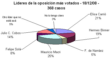 Las respuestas marcan un grupo líder con tres candidatos: M. Macri con el 25%, Elisa Carrió con el 21% y el gobernador de Santa Fe Hermes Binner con el 19%.