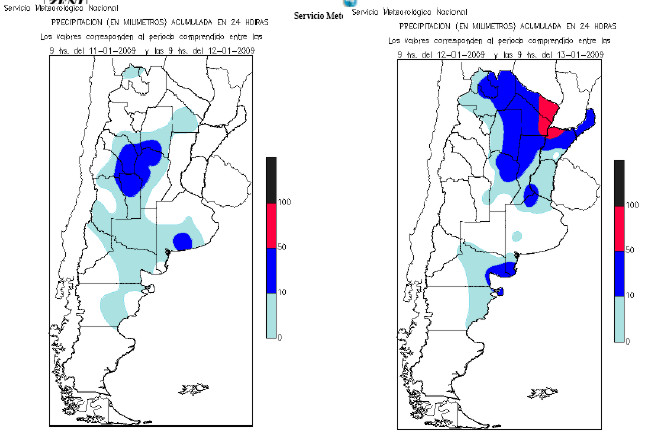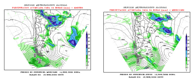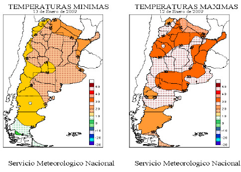 ESTE DE JUJUY, ESTE DE SALTA Y TUCUMAN CIELO NUBLADO. PROBABILIDAD DE TORMENTAS AISLADAS, LUEGO LLUVIAS Y TORMENTAS. VIENTOS LEVES DEL NORESTE. TEMPERATURA MÍNIMA ENTRE 20°C Y 25ºC. TEMPERATURA MÁXIMA ENTRE 32ºC Y 38ºC. SANTIAGO DEL ESTERO, CHACO, FORMOSA Y NORTE DE SANTA FE CIELO PARCIALMENTE NUBLADO O NUBLADO. TIEMPO INESTABLE CON PROBABILIDAD DE PRECIPITACIONES, ESPECIALMENTE A LA TARDE O NOCHE. VIENTOS LEVES DEL NORESTE. TEMPERATURA MÍNIMA ENTRE 21°C Y 25ºC. TEMPERATURA MÁXIMA ENTRE 35ºC Y 40ºC. MISIONES Y CORRIENTES CIELO ALGO NUBLADO. VIENTOS LEVES DEL SECTOR SUR, LUEGO DE DIRECCIONES VARIABLES, CAMBIANDO AL NORESTE. TEMPERATURA MÍNIMA ENTRE 20°C Y 24ºC. TEMPERATURA MÁXIMA ENTRE 33ºC Y 36ºC. ESTE DE ENTRE RIOS, CENTRO Y SUR DE SANTA FE Y ESTE DE CORDOBA NUBOSIDAD VARIABLE. TIEMPO INESTABLE. VIENTOS LEVES DEL NORESTE, ROTANDO AL NORTE. TEMPERATURA MÍNIMA ENTRE 20°C Y 23ºC. TEMPERATURA MÁXIMA ENTRE 36ºC Y 40ºC. NOROESTE DE CORDOBA Y NORTE DE SAN LUIS CIELO NUBLADO. PROBABILIDAD DE AISLADAS. VIENTOS LEVES DEL SECTOR NORTE. TEMPERATURA MÍNIMA ENTRE 20°C Y 25ºC. TEMPERATURA MÁXIMA ENTRE 33 ºC Y 36ºC. NORESTE DE BUENOS AIRES CIELO PARCIALMENTE NUBLADO. VIENTOS LEVES DEL NORESTE, ROTANDO AL SECTOR NORTE. TEMPERATURA MÍNIMA ENTRE 21°C Y 24ºC TEMPERATURA MÁXIMA ENTRE 35ºC Y 39ºC. OESTE DE BUENOS AIRES CIELO ALGO A PARCIALMENTE NUBLADO. TIEMPO INESTABLE. VIENTOS LEVES A MODERADOS DEL SECTOR NORTE, ROTANDO AL SECTOR OESTE. TEMPERATURA MÍNIMA ENTRE 17°C Y 19ºC TEMPERATURA MÁXIMA ENTRE 34ºC Y 37ºC. SUDESTE DE BUENOS AIRES CIELO NUBLADO. TIEMPO INESTABLE CON PROBABILIDAD DE PRECIPITACIONES A LA TARDE O NOCHE. VIENTOS MODERADOS DEL SECTOR NORTE. TEMPERATURA MÍNIMA ENTRE 16ºC Y 21ºC. TEMPERATURA MÁXIMA ENTRE 27ºC Y 35ºC. SUR DE SAN LUIS, SUR DE CORDOBA Y NORESTE DE LA PAMPA CIELO ALGO A PARCIALMENTE NUBLADO. TIEMPO INESTABLE A LA TARDE O NOCHE.. VIENTOS LEVES A MODERADOS DEL NOROESTE. TEMPERATURA MÍNIMA ENTRE 19ºC Y 24ºC. TEMPERATURA MÁXIMA ENTRE 35ºC Y 38ºC. SUDESTE, CENTRO Y OESTE DE LA PAMPA CIELO ALGO A PARCIALMENTE NUBLADO. PROBABILIDAD DE TORMENTAS AISLADAS A LA TARDE O NOCHE.. VIENTOS MODERADOS DEL SECTOR SUR. TEMPERATURA MÍNIMA ENTRE 15ºC Y 18ºC. TEMPERATURA MÁXIMA ENTRE 32ºC Y 35ºC. EXTREMO SUR DE BUENOS AIRES CIELO ALGO O PARCIALMENTE NUBLADO. VIENTOS MODERADOS DEL NOROESTE, ROTANDO AL OESTE. TEMPERATURA MÍNIMA ENTRE 12ºC Y 15ºC. TEMPERATURA MÁXIMA ENTRE 30ºC Y 32ºC.