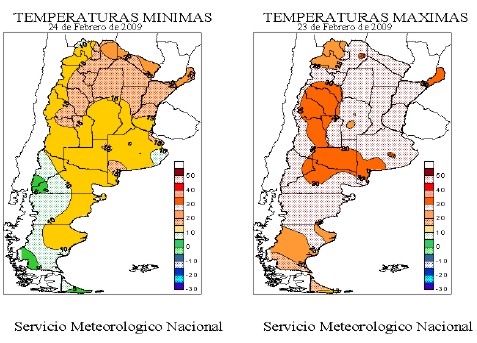 ESTE DE JUJUY Y TUCUMAN NUBOSIDAD VARIABLE. PROBABILIDAD DE PRECIPITACIONES. VIENTOS LEVES DEL SECTOR NORTE. TEMPERATURA MÍNIMA ENTRE 18ºC Y 22ºC. TEMPERATURA MÁXIMA ENTRE 27ºC Y 30ºC. ESTE DE SALTA, NORTE Y OESTE DE SANTIAGO DEL ESTERO Y NOROESTE DE CORDOBA Y NORTE DE SAN LUIS NUBOSIDAD VARIABLE. VIENTOS LEVES DEL SECTOR NORTE. TEMP. MÍNIMA ENTRE 18ºC Y 22ºC. TEMP. MÁXIMA ENTRE 30ºC Y 34ºC. MISIONES, FORMOSA, CHACO, CORRIENTES Y NORESTE DE SANTIAGO DEL ESTERO NUBOSIDAD VARIABLE. PROBABILIDAD DE PRECIPITACIONES. VIENTOS LEVES DEL SECTOR ESTE. TEMPERATURA MÍNIMA ENTRE 20ºC Y 23ºC. TEMPERATURA MÁXIMA ENTRE 29ºC Y 33ºC. SUDESTE DE SANTIAGO DEL ESTERO, NORESTE, CENTRO Y SUR DE CORDOBA, SANTA FE, ENTRE RÍOS Y NORESTE DE BUENOS AIRES NUBOSIDAD VARIABLE. VIENTOS LEVES DEL NORESTE. TEMP. MÍNIMA ENTRE 16ºC Y 20ºC. TEMPERATURA MÁXIMA ENTRE 29ºC Y 32ºC. SAN LUIS, LA PAMPA Y OESTE DE BUENOS AIRES CIELO ALGO NUBLADO. VIENTOS LEVES DEL SECTOR NORTE. TEMPERATURA MÍNIMA ENTRE 16ºC Y 19ºC. TEMPERATURA MÁXIMA ENTRE 30ºC Y 34ºC. SUDESTE DE BUENOS AIRES CIELO ALGO NUBLADO. VIENTOS LEVES DEL NORESTE. TEMP. MÍNIMA ENTRE 16ºC Y 18ºC. TEMPERATURA MÁXIMA ENTRE 26ºC Y 30ºC.