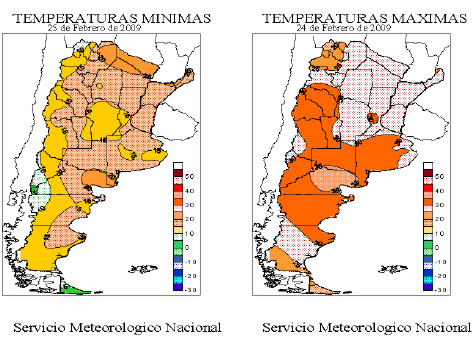 ESTE DE JUJUY Y TUCUMAN NUBOSIDAD VARIABLE. INESTABLE CON PROBABILIDAD DE PRECIPITACIONES. VIENTOS LEVES DEL SECTOR NORTE. TEMPERATURA MÍNIMA ENTRE 18ºC Y 22ºC. TEMPERATURA MÁXIMA ENTRE 27ºC Y 30ºC. ESTE DE SALTA NUBOSIDAD VARIABLE. VIENTOS LEVES DEL SECTOR NORTE. TEMPERATURA MÍNIMA ENTRE 18ºC Y 22ºC. TEMPERATURA MÁXIMA ENTRE 30ºC Y 34ºC. SANTIAGO DEL ESTERO, NORTE DE CORDOBA Y NORTE DE SAN LUIS NUBOSIDAD VARIABLE. VIENTOS LEVES DEL SECTOR NORTE. TEMPERATURA MÍNIMA ENTRE 18ºC Y 22ºC. TEMPERATURA MÁXIMA ENTRE 30ºC Y 34ºC. MISIONES, FORMOSA, CHACO Y CORRIENTES NUBOSIDAD VARIABLE. PROBABILIDAD DE PRECIPITACIONES. VIENTOS LEVES DEL SECTOR ESTE. TEMPERATURA MÍNIMA ENTRE 20ºC Y 23ºC. TEMPERATURA MÁXIMA ENTRE 29ºC Y 33ºC. SUR DE CORDOBA, SANTA FE, ENTRE RÍOS Y NORTE DE BUENOS AIRES NUBOSIDAD VARIABLE. VIENTOS LEVES DEL NORESTE. TEMPERATURA MÍNIMA ENTRE 16ºC Y 20ºC. TEMPERATURA MÁXIMA ENTRE 29ºC Y 32ºC. SUR DE SAN LUIS, LA PAMPA Y CENTRO Y SUR DE BUENOS AIRES CIELO ALGO NUBLADO. VIENTOS LEVES DEL SECTOR NORTE. TEMPERATURA MÍNIMA ENTRE 16ºC Y 19ºC. TEMPERATURA MÁXIMA ENTRE 30ºC Y 34ºC.