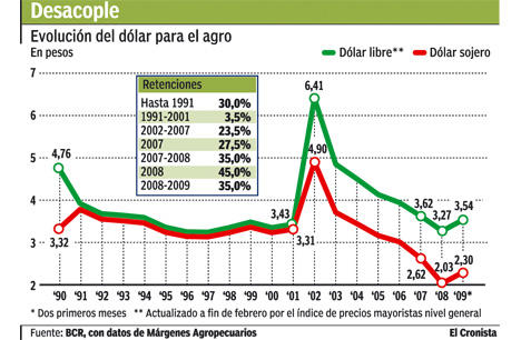 En 2008, con un dólar libre de $ 3,27, el dólar sojero se situó en $ 2,03, considerando los cuatro meses de retenciones en torno del 45% que transcurrieron entre la promulgación y la derogación de la famosa Resolución 125.
