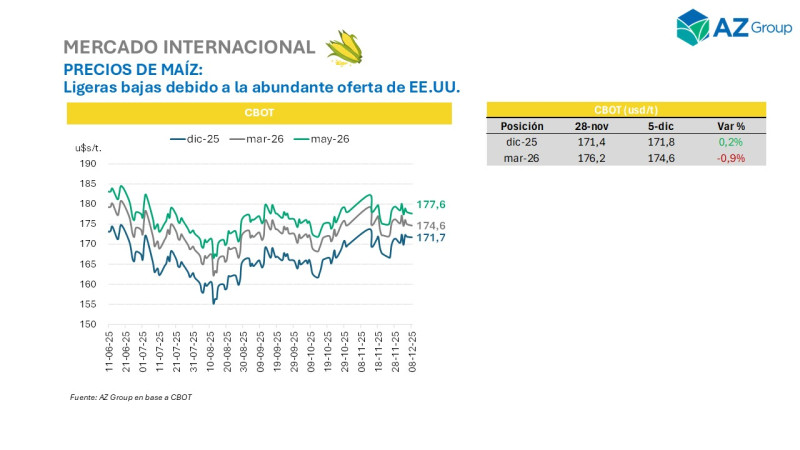 Los precios del maíz cerraron la semana pasada con leves retrocesos, en un contexto de creciente cautela del mercado ante la publicación del próximo informe del USDA. Los operadores anticipan un ajuste moderado en los stocks finales de Estados Unidos, que podrían reducirse desde 2.154 millones de bushels, equivalentes a aproximadamente 54,7 millones de toneladas, hasta 2.129 millones de bushels, cerca de 54,1 millones de toneladas, aunque sin grandes cambios estructurales en este reporte de diciembre...